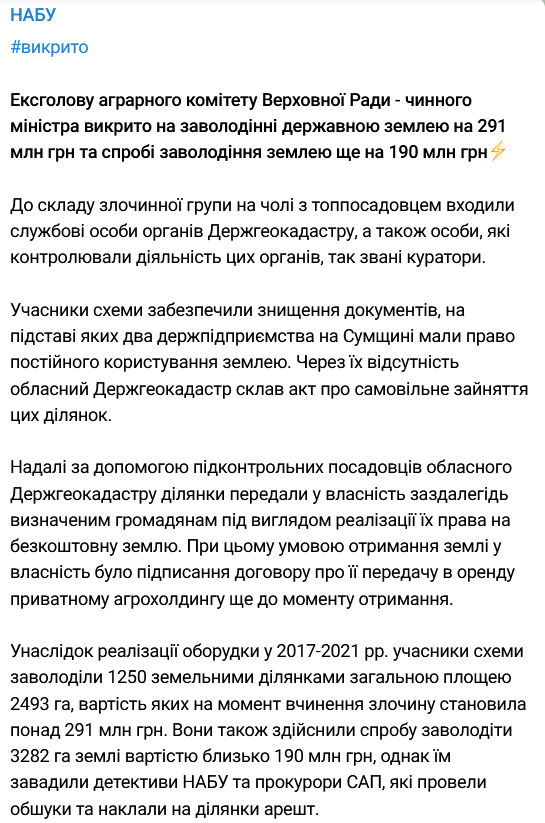 "Обстоятельства семилетней давности касаются спора между государственными предприятиями и физлицами, в частности военными АТО за земли, которые были предоставлены последним во владение в соответствии с законом. Споры решаются судами, в том числе Верховным судом, и, как мне известно, на сегодняшний день ряд решений констатируют отсутствие права госпредприятий на земли, которые, вероятно, имеет в виду НАБУ", - пишет министр.