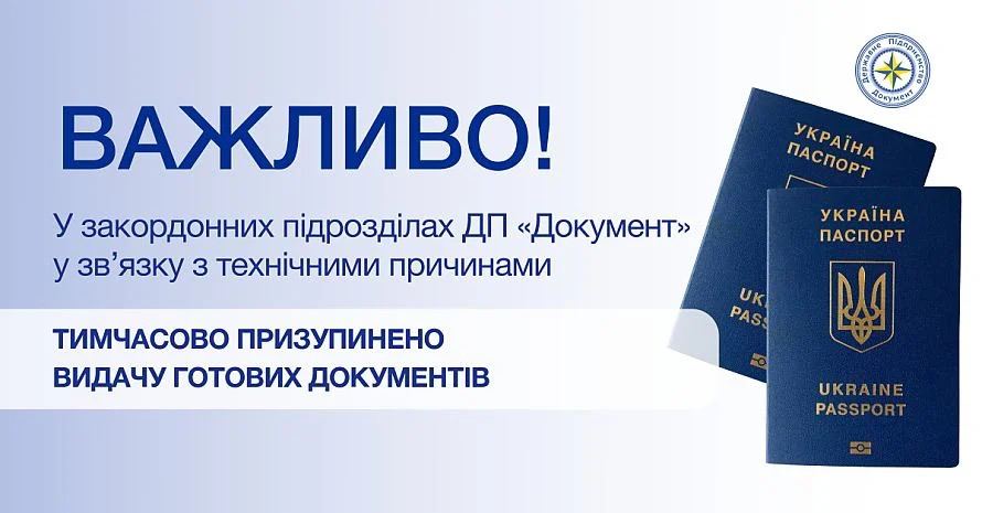 Госпредприятие "Документ" официально заявило о приостановке выдачи документов за рубежом. Сообщается, что выдача паспортов возможна для детей младше 12 лет, в связи с отсутствием необходимости биометрической верификации.