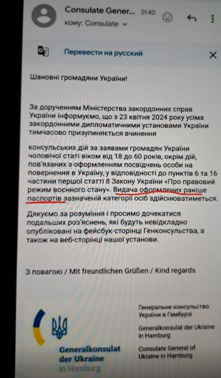 Украинское консульство в Гамбурге продолжит выдачу ранее оформленных паспортов мужчинами призывного возраста.