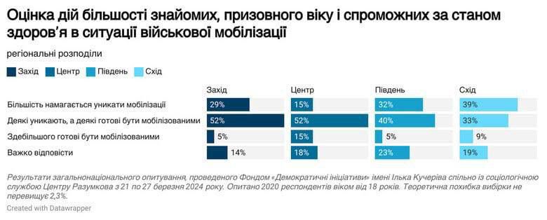 Стремление избежать мобилизации более распространено в восточном регионе. Здесь 39% опрошенных указали, что большинство из их знакомых, которые подлежат мобилизации, пытаются избежать этого, тогда как в южном регионе доля таких составляет 32%, а в западном – 29%. Наименьшей (15%) она оказалась в центральном регионе.