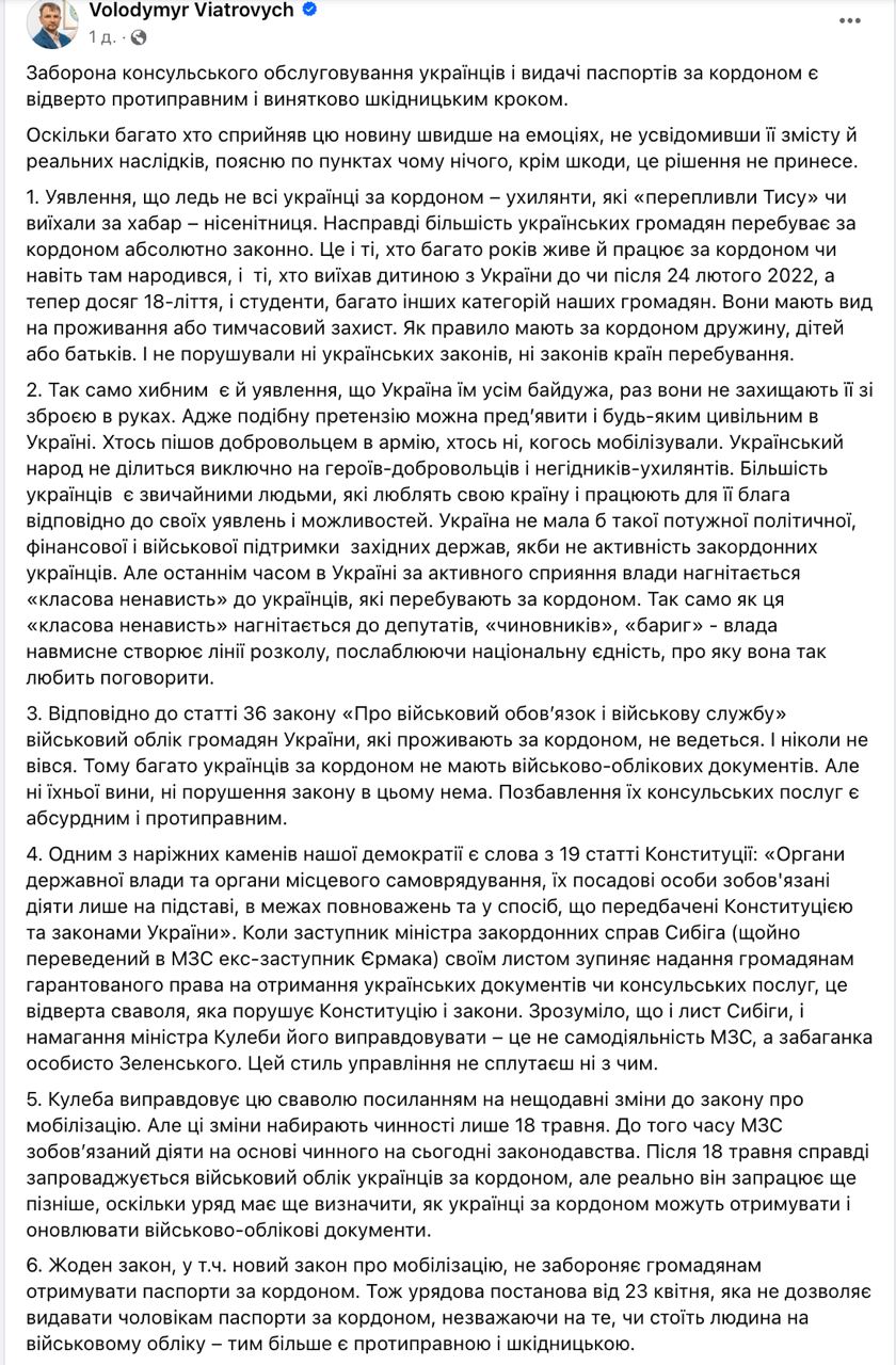 Постановление Дмитрия Кулебы он назвал "произволом". И отметил, что ни один закон, в том числе новый закон об ужесточении мобилизации, не запрещает гражданам получать паспорта за рубежом. А воинский учет граждан за рубежом по закону "не ведется и никогда не велся".