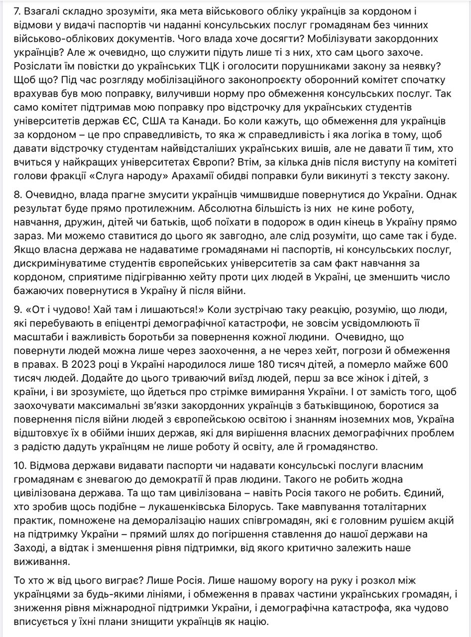 "Отказ государства выдавать паспорта или предоставлять консульские услуги собственным гражданам является пренебрежением к демократии и правам человека. Даже Россия такого не делает. Это прямой путь к ухудшению отношения к нашему государству на Западе, а затем и уменьшению уровня поддержки, от которого критически зависит наше выживание", - резюмировал нардеп.