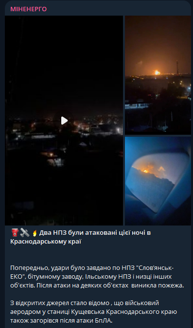 Минэнерго Украины в своем телеграм-канале также сообщило, что удары наносились по Ильскому НПЗ и битумному заводу.