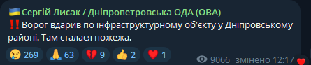 "Враг ударил по инфраструктурному объекту в Днепровском районе. Там возник пожар", - заявил Лысак.