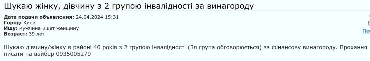 В Киеве мужчины публикуют объявления о поиске женщин с инвалидностью или многодетных матерей.