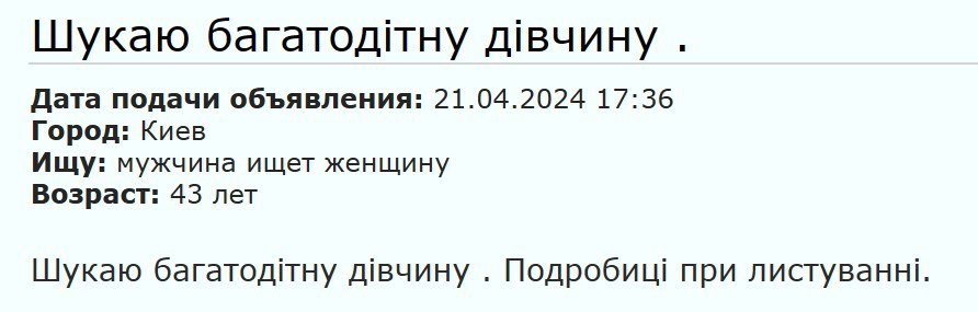 Судя по всему, размещают такие объявления мужчины, пытающиеся выехать за границу на основании брака с многодетной матерью или женщиной-инвалидом.