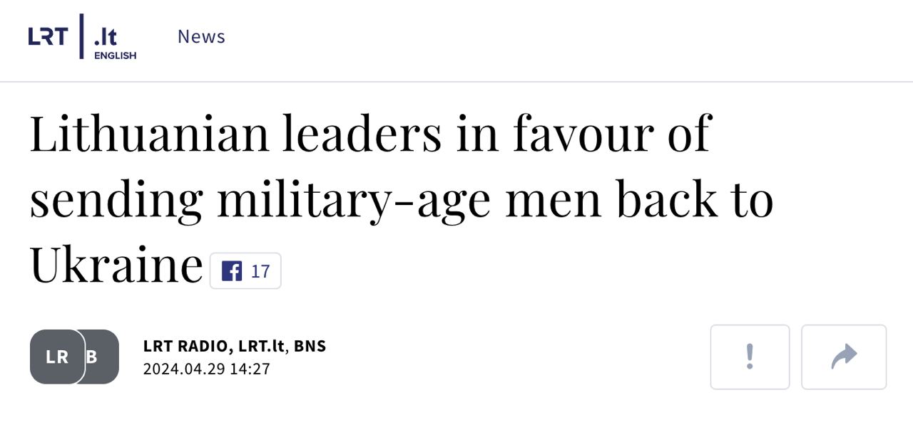 Власти Литвы поддержали идею возвращения в Украину мужчин призывного возраста. Президент Гитанас Науседа заявил, что Украина должна иметь средства и инструменты, чтобы "пригласить своих молодых мужчин служить родине".