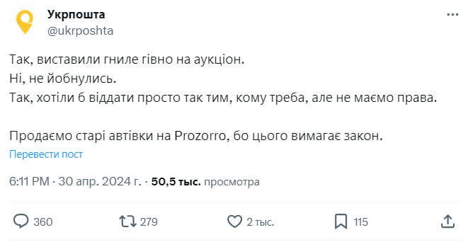 "Да, выставили гнилое говно на аукцион. Нет, не е@нулись. Да, хотели бы отдать просто так тем, кому нужно, но не имеем права. Продаем старые авто на Prozorro, потому что этого требует закон", – говорится в комментарии "Укрпочты".