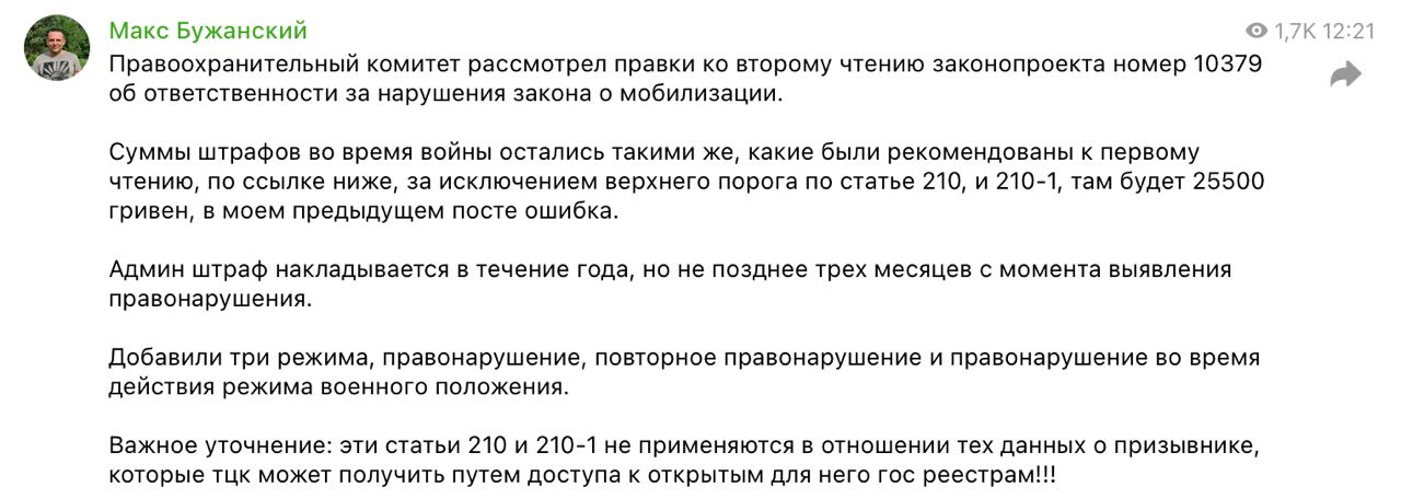 Итого комитет предлагает штрафовать граждан за нарушение правил воинского учёта и законодательства про оборону и мобилизацию в военное время на сумму от 17 000 до 25 500 гривен.
