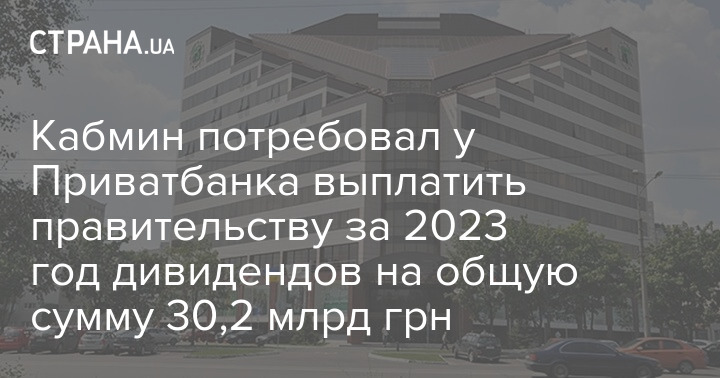 Кабинет министров Украины потребовал у государственного Приватбанка выплатить правительству (владельцу) за 2023 год дивидендов на общую суму 30,2 млрд грн.