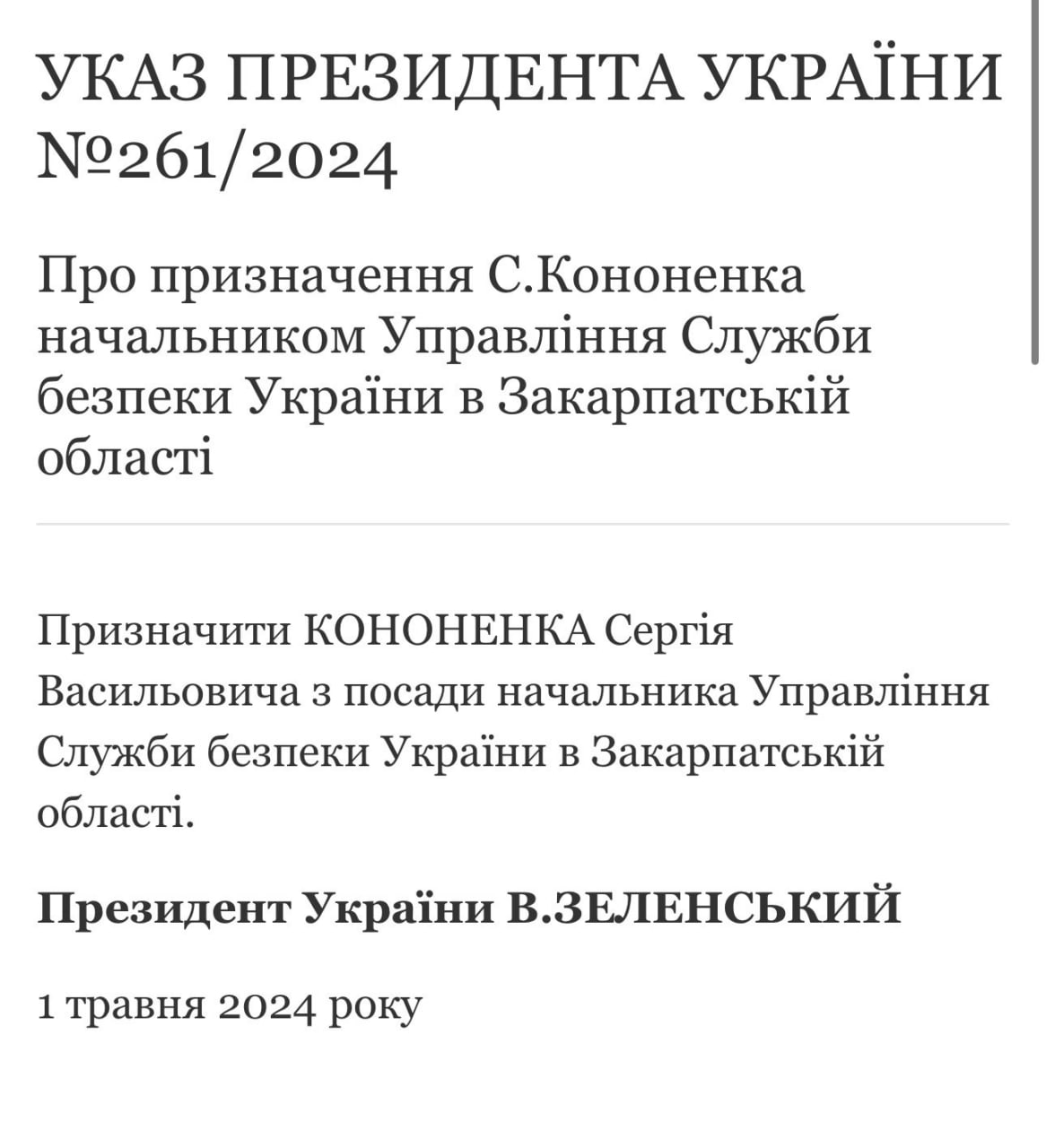 Указом Зеленского Кононенко Сергей Васильевич назначен на должность начальника управления СБУ в Закарпатской области.