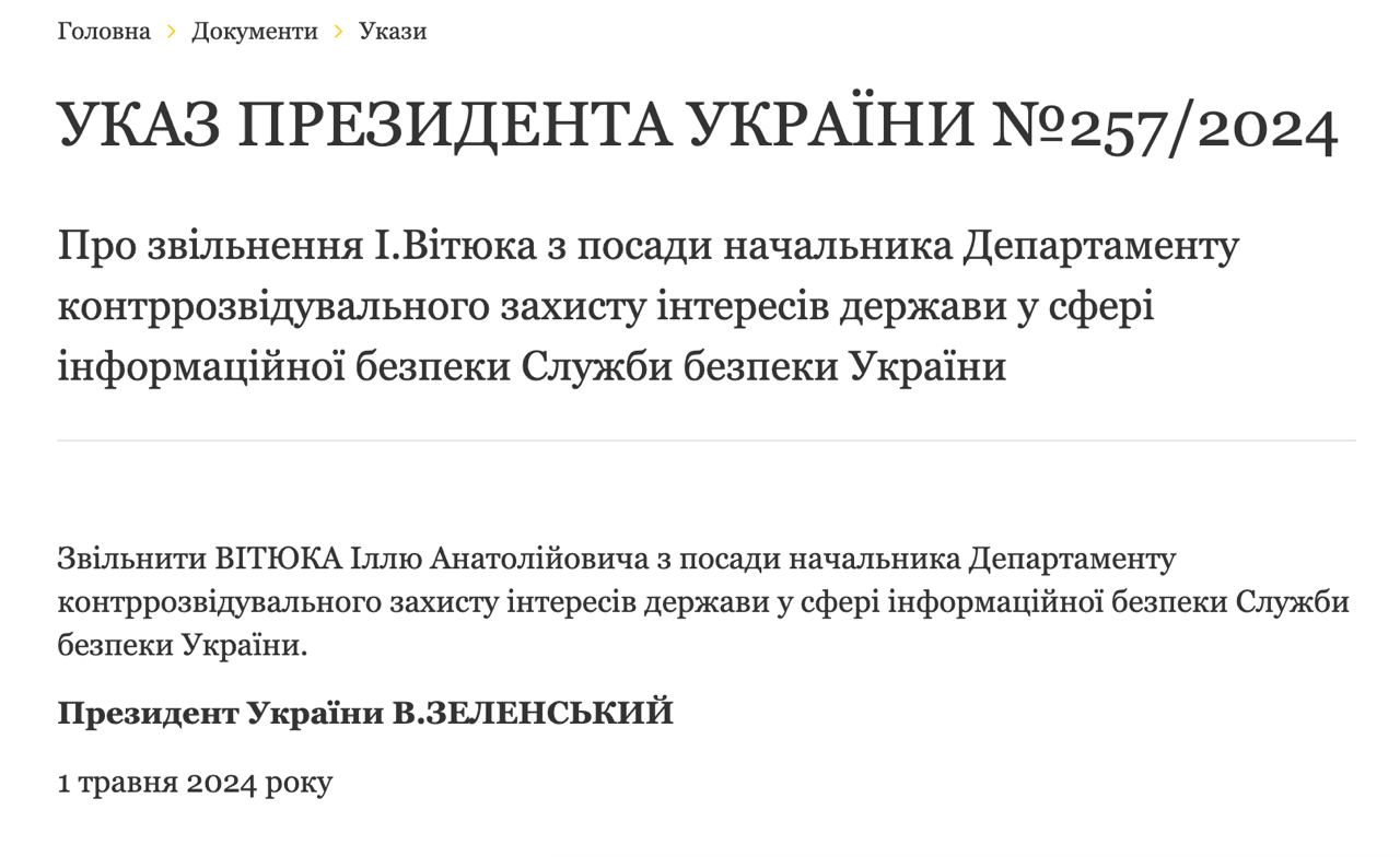 Также сегодня президент Владимир Зеленский уволил начальника департамента кибербезопасности СБУ Илью Витюка, о чем свидетельствует соответствующий указ.