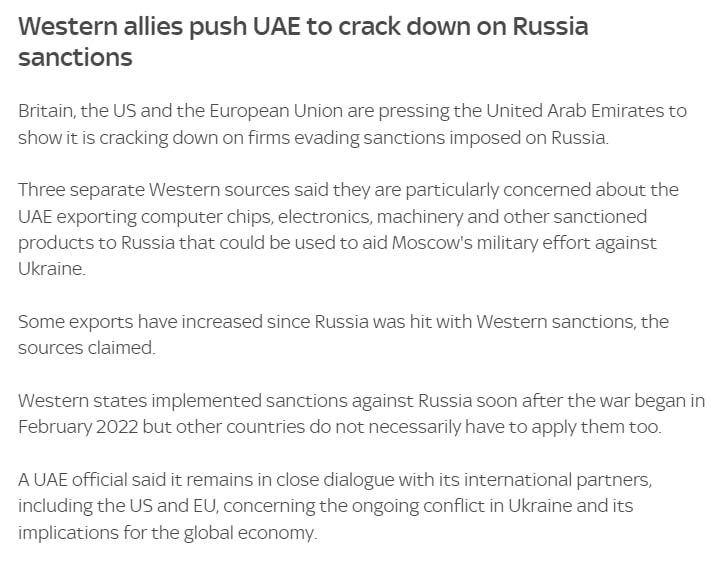По информации трех источников издания, Британия, США и Евросоюз особенно обеспокоены экспортом из ОАЭ в Россию компьютерных чипов, электроники, автомобилей и других подсанкционных товаров, которые могут быть использованы для помощи в войне против Украины.