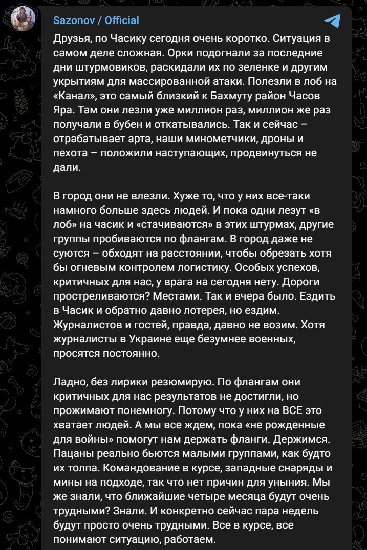 Сазонов пишет, что одни части РФ атакуют город в лоб, неся потери, но другие обходят Часов Яр по флангам, чтобы поставить под огневой контроль логистику ВСУ. Дороги, по его словам, "местами простреливаются".