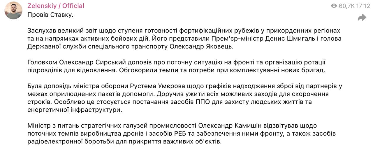 17.34 На очередной Ставке верховного главнокомандующего обсуждали строительство укреплений, ситуацию на фронте, ротацию текущих подразделений, комплектование новых бригад, поставки западного оружия и собственное производство дронов и систем РЭБ.