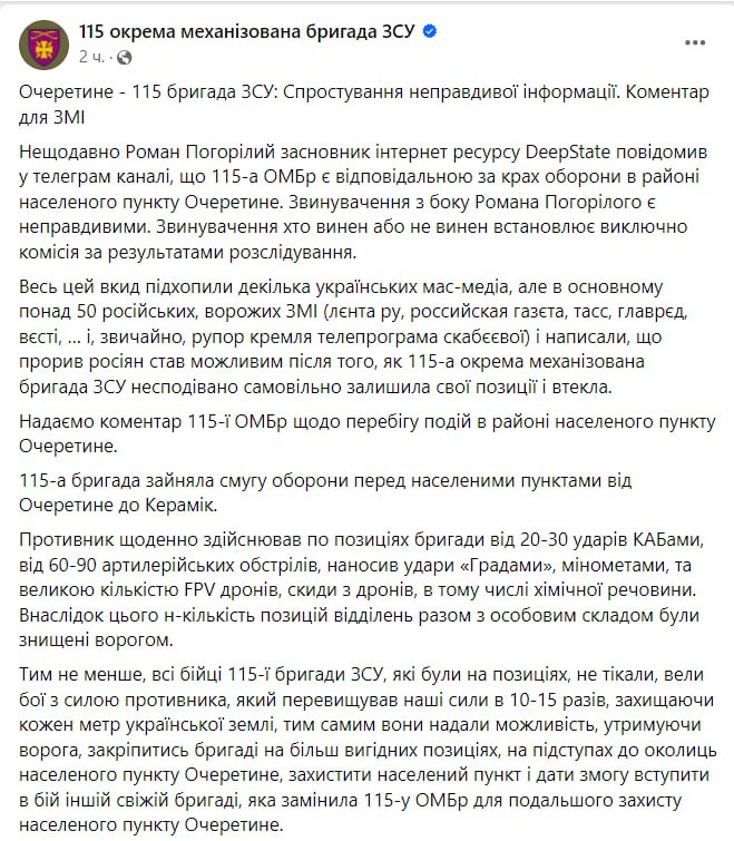 Пресс-служба 115 ОМБр называет "неправдивым" заявление, что "прорыв россиян стал возможным после того, как 115-я отдельная механизированная бригада ВСУ неожиданно самовольно покинула свои позиции и скрылась".