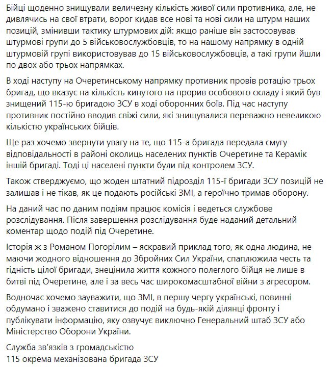 В заявлении говорится, что 115-я бригада занимала полосу обороны перед населенными пунктами от Очеретино до Керамика, и россияне постоянно наносили по ней удары, в результате чего некоторое "количество позиций отделений вместе с личным составом были уничтожены".