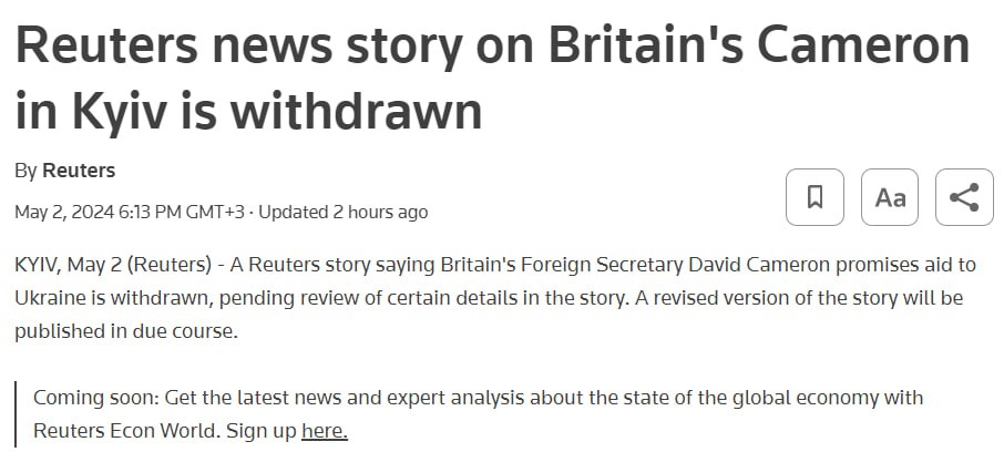 Однако само агентство на своем сайте написало, что отозвало публикацию о заявлениях Кэмерона относительно помощи Украине.