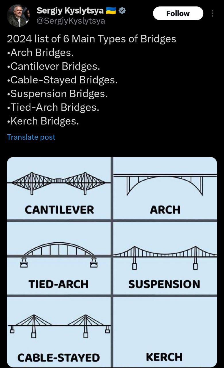 В соцсети X Кислица опубликовал картинку с разными видами мостов - арочные, вантовые, висячие и другие.