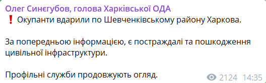 14:37 Глава ОВА Олег Синегубов сообщил, что оккупанты ударили по Шевченковскому району Харькова.