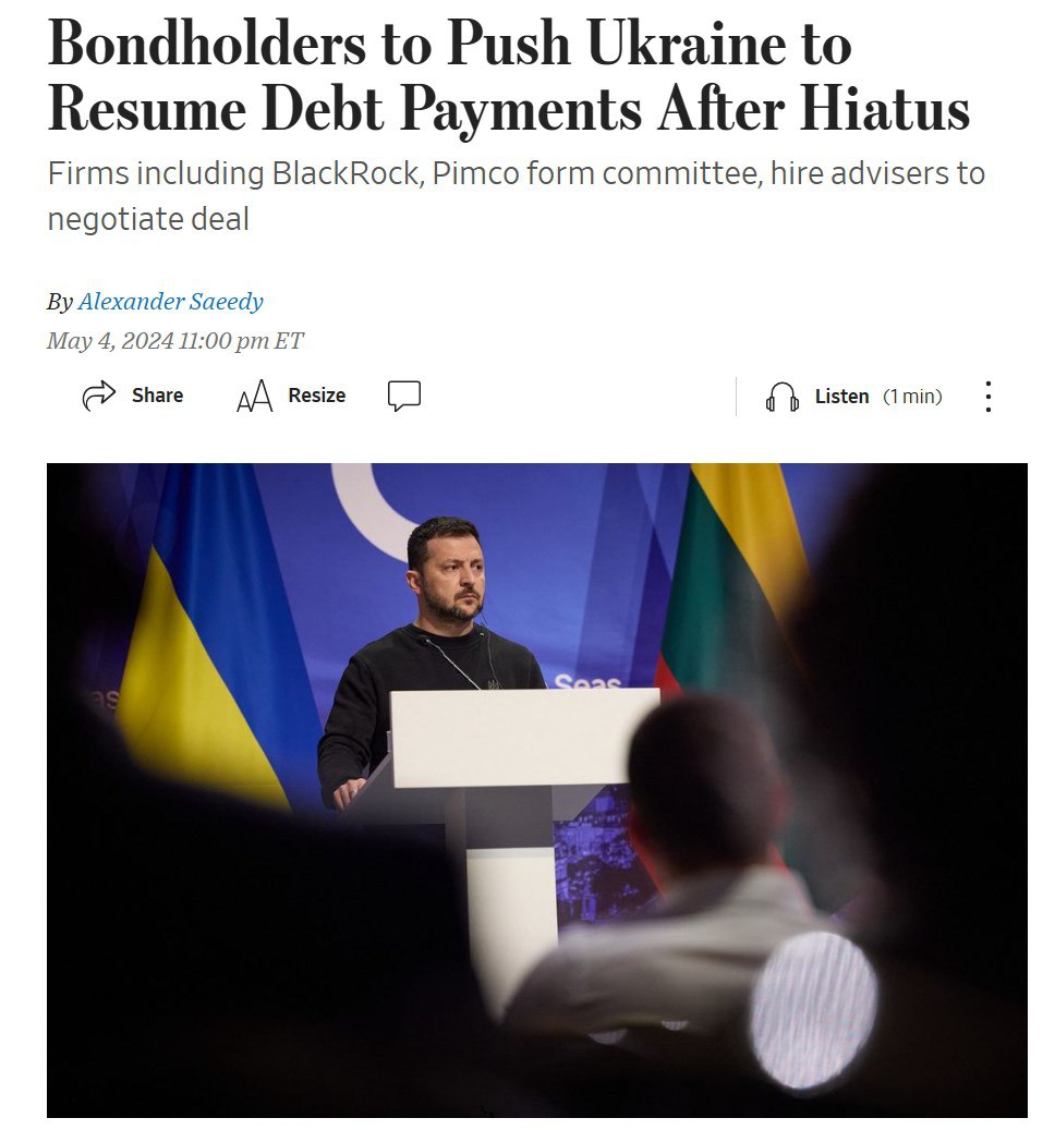 Речь о держателях украинских облигаций, включая инвестиционные компании BlackRock и Pimco. По данным источников, они формируют комиссию и нанимают консультантов для переговоров по возобновлению выплат, которые были приостановлены после начала войны в Украине.