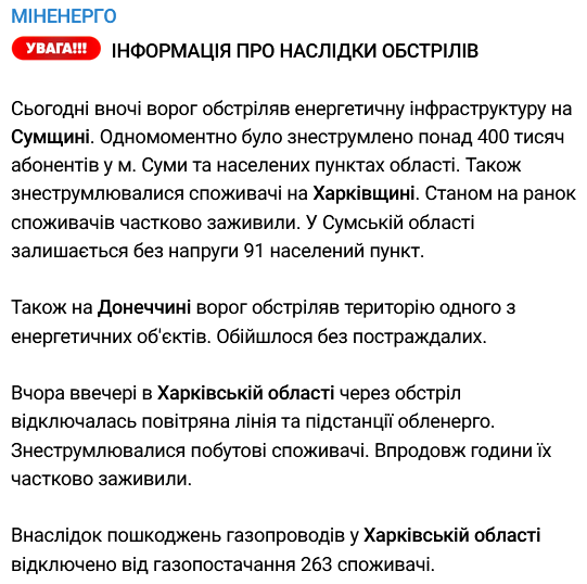 В Минэнерго добавили, что ночью отключения света были и у потребителей в Харьковской области.