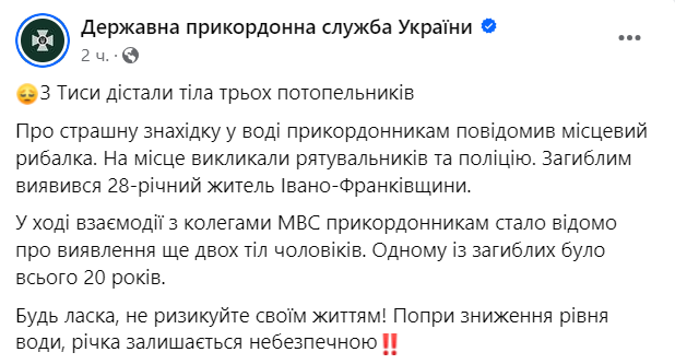 Также в конце апреля пограничники в Тисе обнаружили тела двух мужчин. Из-за высоких порогов и сильного течения извлечь тело из воды удалось только на утро.