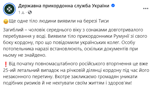 "Погибший – мужчина средних лет с признаками длительного пребывания в воде. Обнаружили тело пограничники Румынии со своей стороны границы, о чем сообщили украинским коллегам. Личность утопленника устанавливают, поскольку документы при нем не найдены", - сообщают в ГПСУ.
