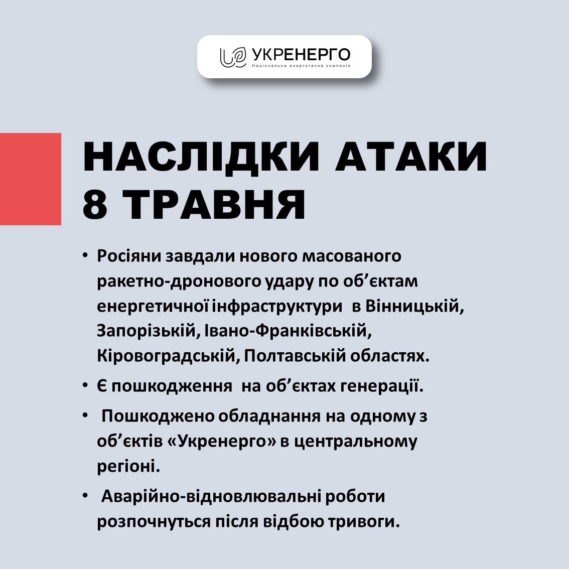"Укрэнерго" заявляет, что были удары по энергетике Винницкой, Запорожской, Ивано-Франковской, Кировоградской и Полтавской областях. Есть повреждения объектов генерации.