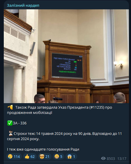 Верховная Рада продлила военное положение и всеобщую мобилизацию в Украине на 90 дней - до 11 августа. За проголосовали 336 депутатов.