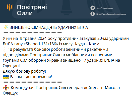 "В ночь на 9 мая 2024 года противник атаковал 20 ударными БПЛА типа Shahed-131/136 с мыса Чауда, Крым. В результате боевой работы зенитными ракетными подразделениями Воздушных сил и мобильными огневыми группами Сил обороны Украины уничтожено 17 ударных БПЛА в Одесской области", - говорится в сообщении.