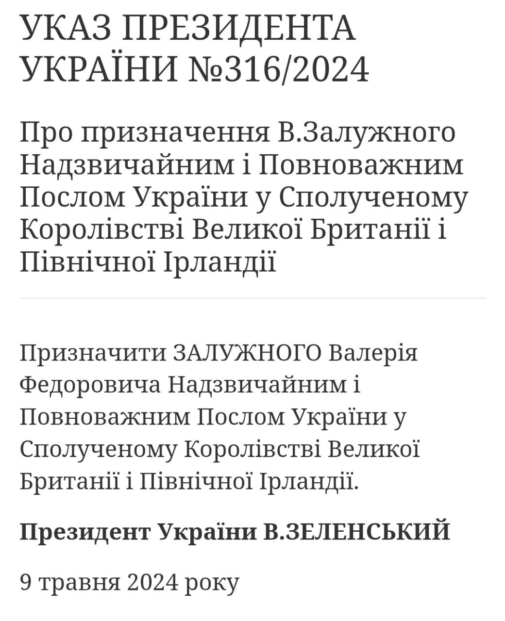 Еще одним указом экс-главком Валерий Залужный официально назначен послом Украины в Великобритании.