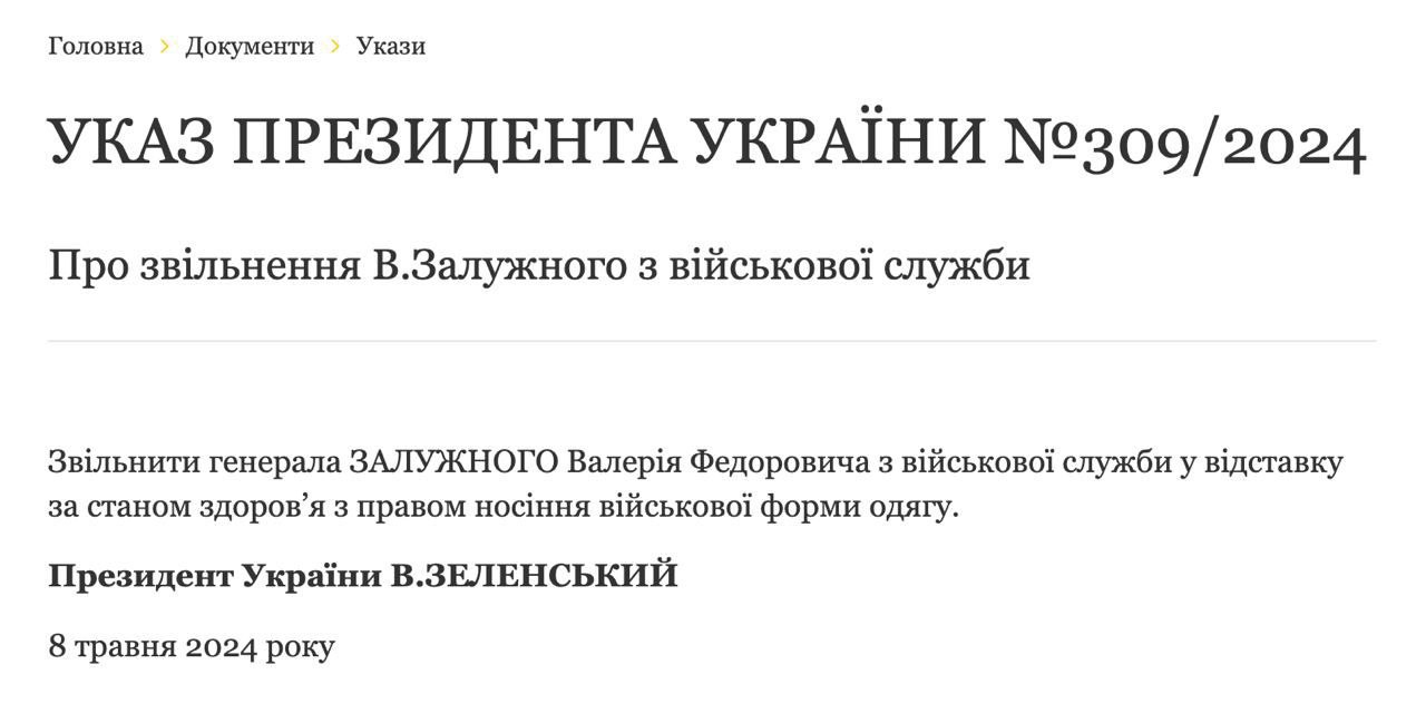 "Уволить генерала Залужного Валерия Федоровича с военной службы в отставку по состоянию здоровья с правом ношения военной формы одежды", - отмечается в указе.