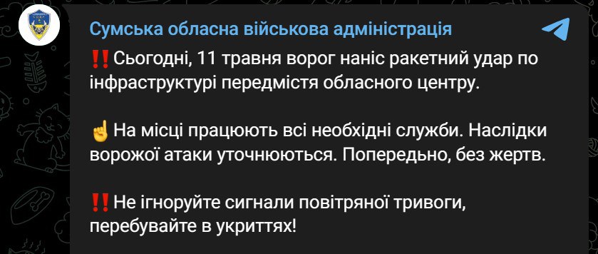 17:21 В пригороде Сум ракета ударила по объекту инфраструктуры, заявила областная военная администрация.
