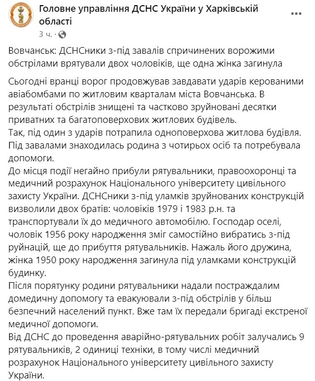 Сегодня утром в результате обстрелов российскими авиабомбами в Волчанске уничтожены и частично разрушены десятки частных и многоэтажных жилых домов. Из-под завалов удалось спасти двух мужчин, еще одна женщина погибла.