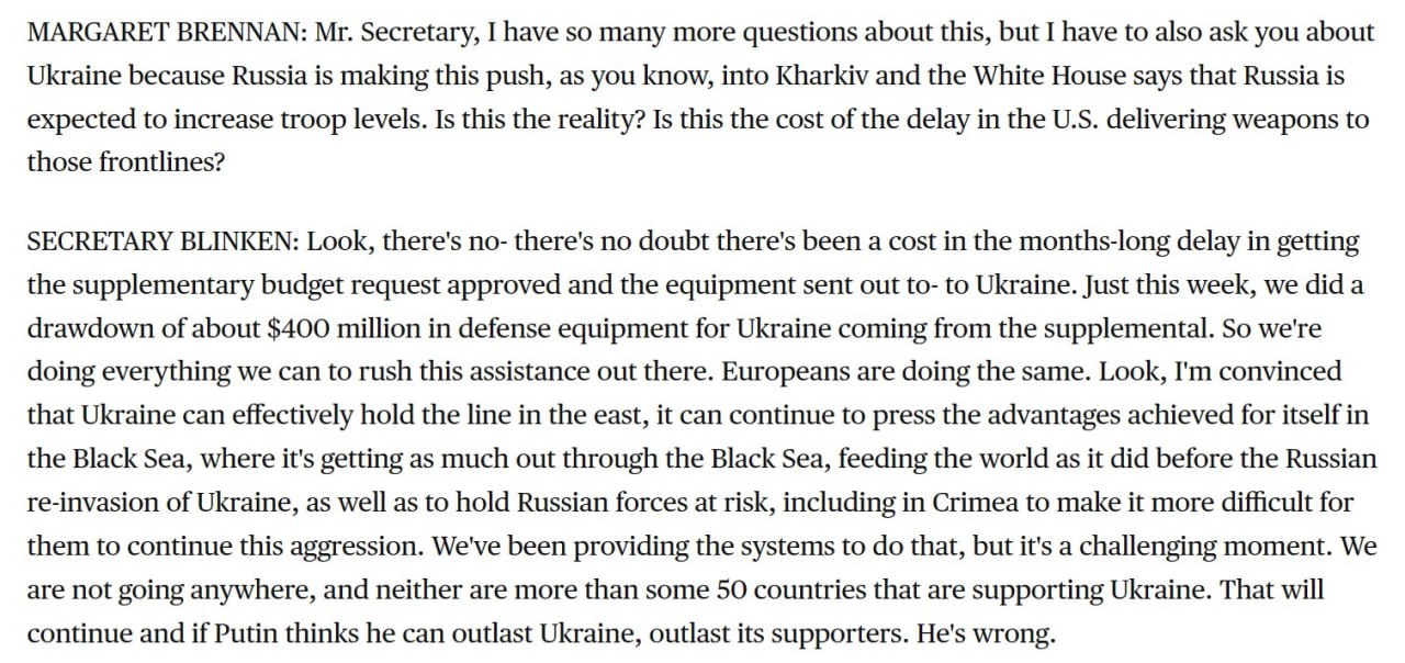 Так глава Госдепа ответил в интервью телеканалу CBS News на вопрос о ситуации в Харьковской области, где наступают россияне.