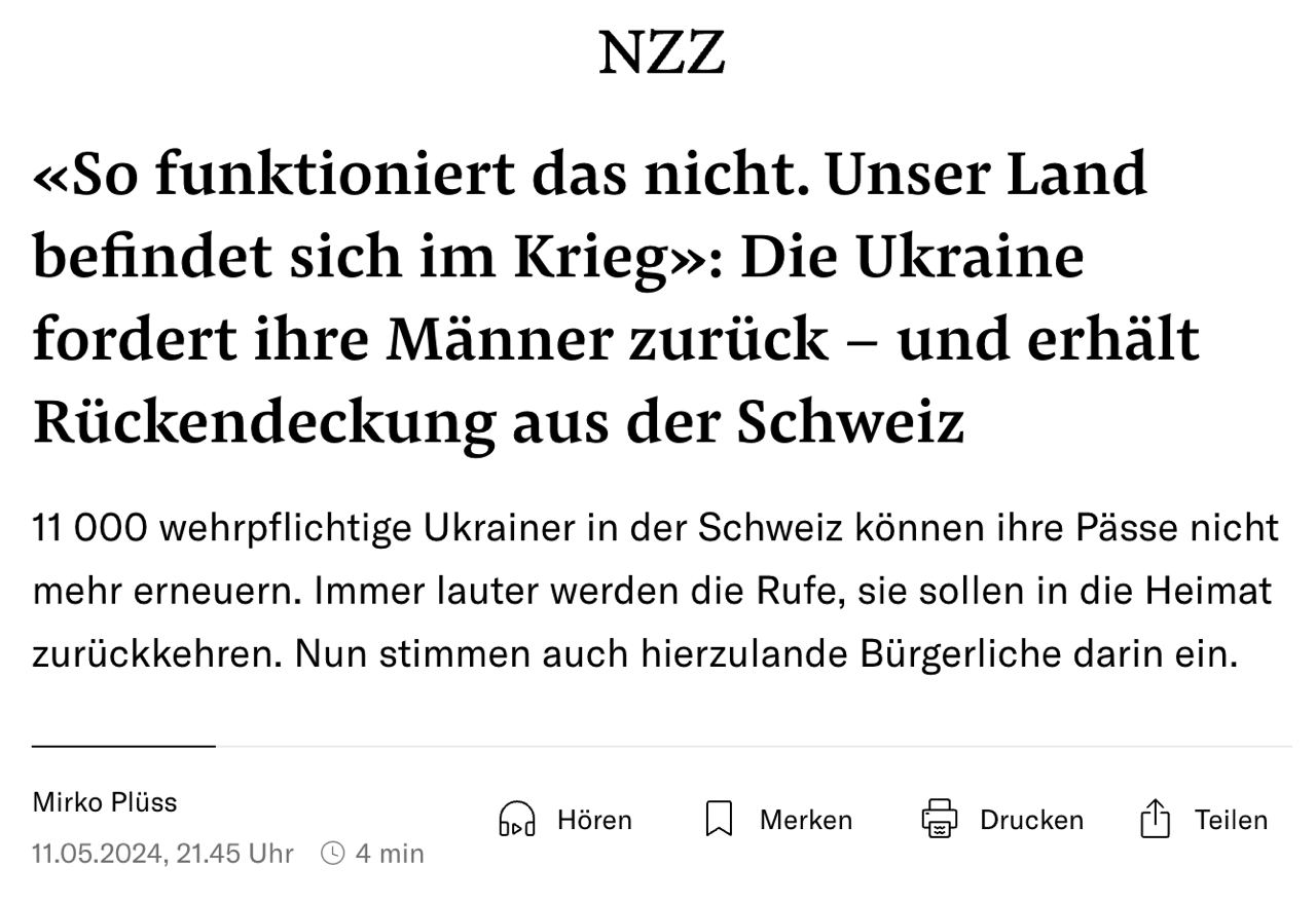 13.27 В Швейцарии отдельные политики призывают помочь Украине вернуть мужчин призывного возраста, пишет Neue Zürcher Zeitung.