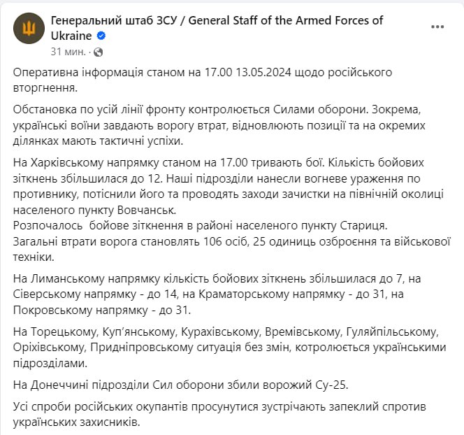 Ранее Генштаб ВСУ также сообщил, что начались бои в районе населённого пункта Старица (западнее Волчанска).