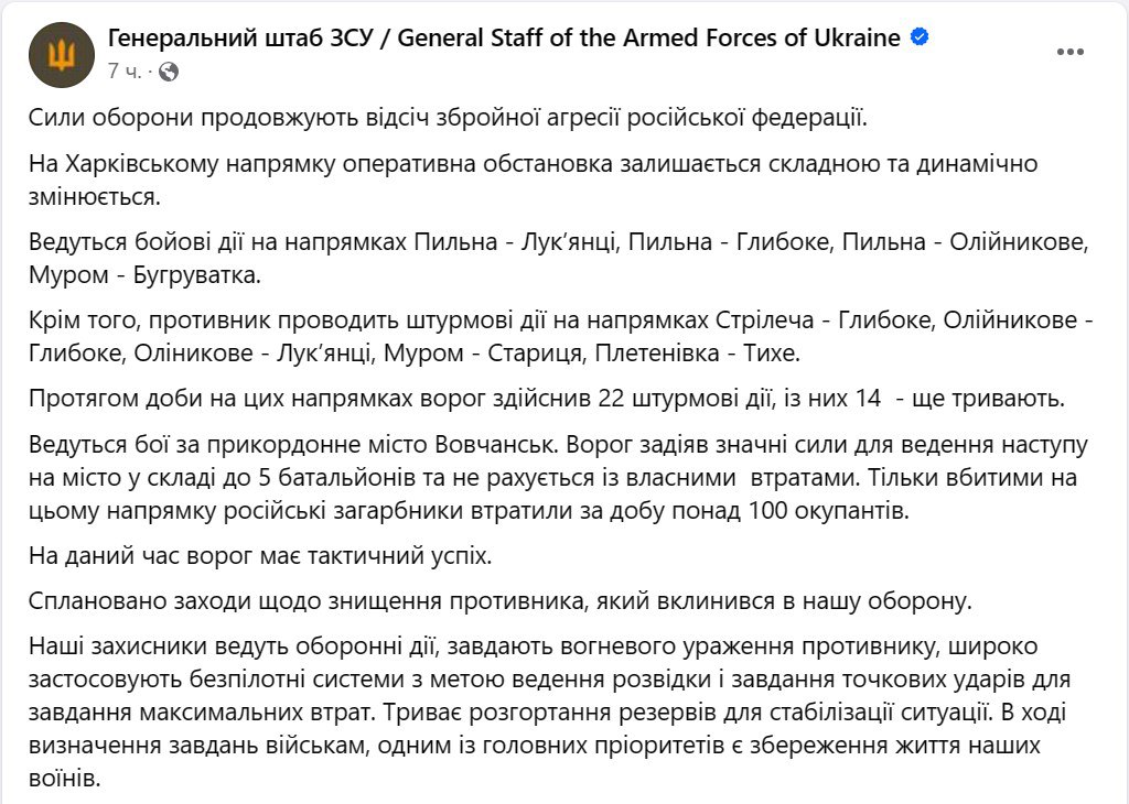 "Ведутся боевые действия на направлениях Пыльная – Лукьянцы, Пыльная – Глубокое, Пыльная – Олейниково, Муром – Бугроватка. Кроме того, противник проводит штурмовые действия на направлениях Стрелечья – Глубокое, Олейниково – Глубокое, Олейниково – Лукьянцы, Муром – Старица, Плетеневка – Тихое".