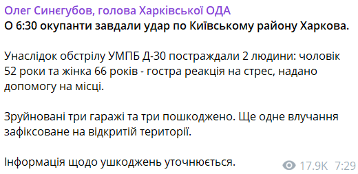 "В 6:30 оккупанты нанесли удар по Киевскому району Харькова. В результате обстрела УМПБ Д-30 пострадали два человека: мужчина 52 года и женщина 66 лет - острая реакция на стресс, оказана помощь на месте. Разрушены три гаража и три повреждены. Еще одно попадание зафиксировано на открытой территории", - говорится в сообщении.
