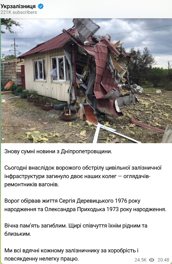 Под Днепром погибли двое сотрудников "Укрзализныци". Фото: Telegram/UkrzalInfo