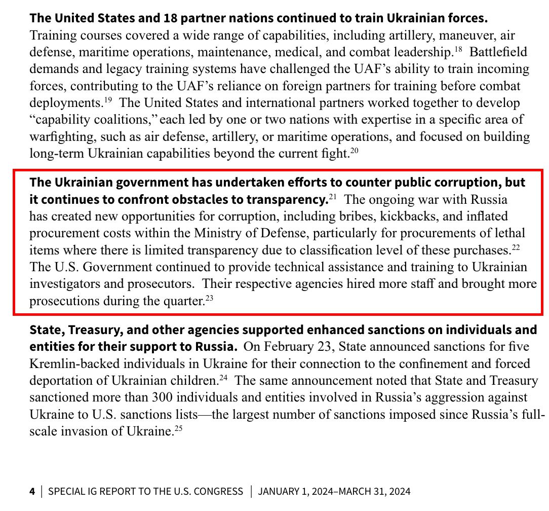 В тексте также сказано, что война с РФ создала возможности для развития коррупции, "в том числе взяточничества и откатов, завышения затрат на закупки в Министерстве обороны, в частности, на закупку летальных единиц, поскольку прозрачность процесса ограничена из-за уровня секретности таких закупок".