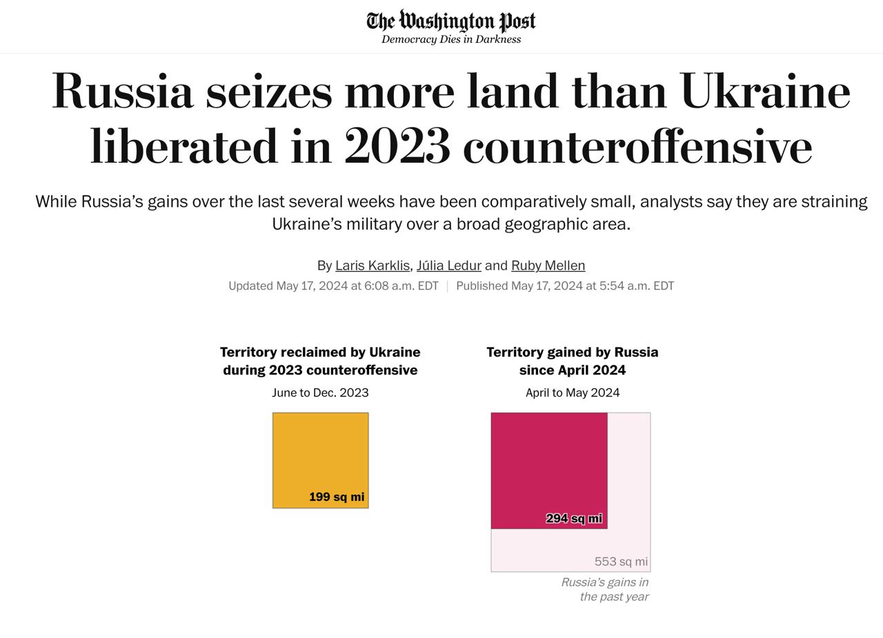 С апреля 2024 армия РФ захватила больше территории, чем Украина освободила за три месяца летнего контрнаступления 2023 года.