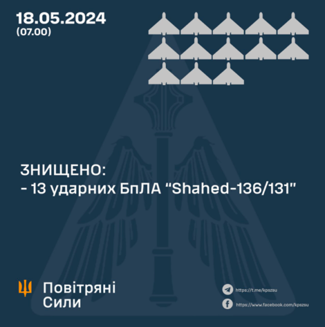 Воздушные силы заявили, что сбили над этими регионами все 13 запущенных Россией "Шахедов".