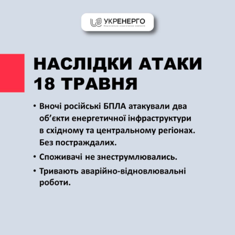 8.28 "Укрэнерго" сообщает, что дроны ночью атаковали два объекта энергетики - в центре и на востоке Украины.