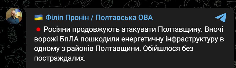 "Россияне продолжают атаковать Полтавщину. Ночью вражеские БПЛА повредили энергетическую инфраструктуру в одном из районов Полтавщины. Обошлось без пострадавших", - заявил он.