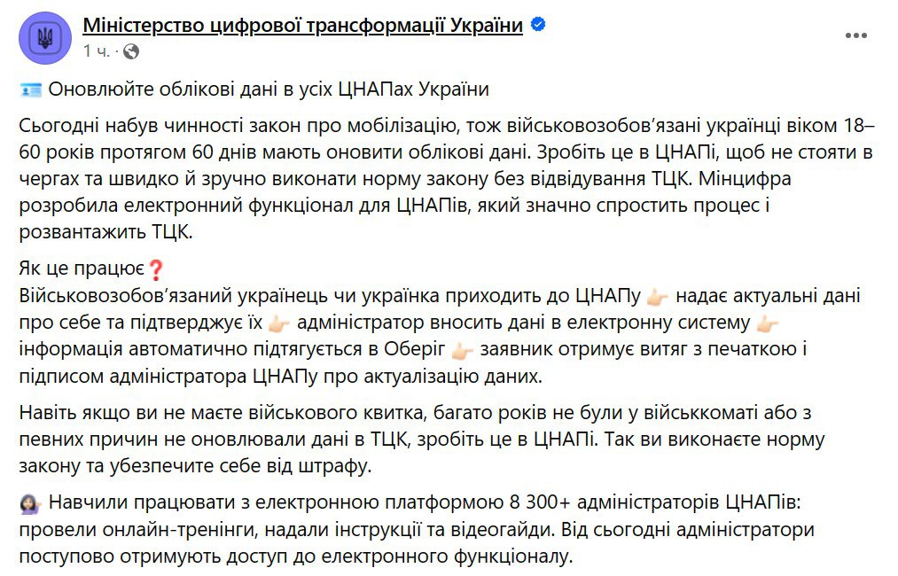 "Даже если у вас нет военного билета, многие годы не были в военкомате или по определенным причинам не обновляли данные в ТЦК, сделайте это в ЦНАПе. Так вы выполните норму закона и обезопасите себя от штрафа", - добавили в Минцифры.
