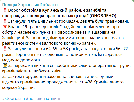 14:49 Сегодня утром российские военные обстреляли Новоосиново и Ковшаровку Купянского района. Погибли пять мирных жителей, еще девять травмированы.