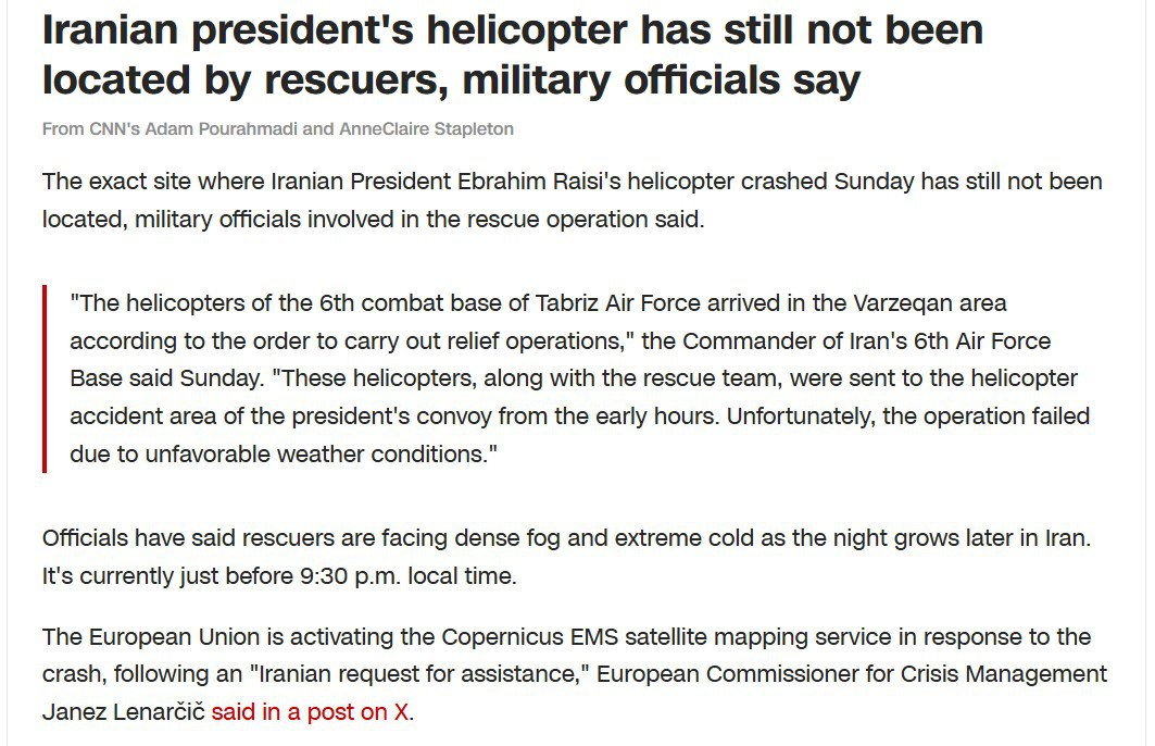 Между тем CNN со ссылкой на данные иранского агентства Fars сообщает, что иранские официальные лица разговаривали с двумя людьми, находившимися на том же вертолете, что и президент.