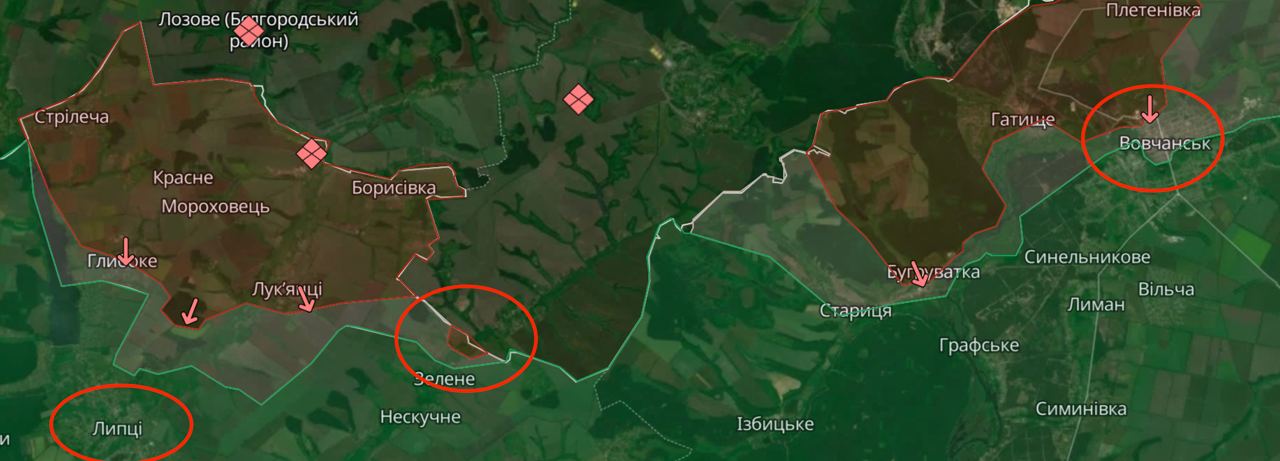 Зеленое находится у границы, между двумя текущими направлениями наступления РФ - в сторону Волчанска и Липцев.